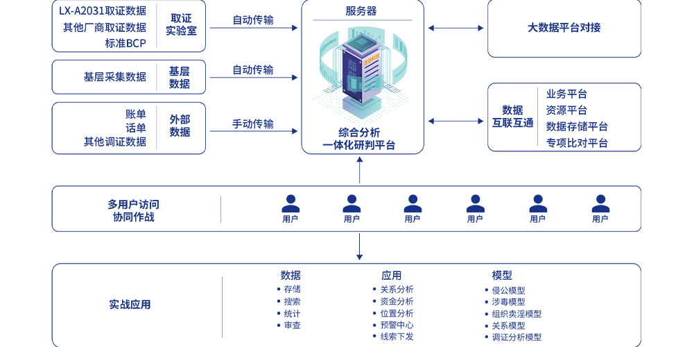 支持接入取证数据、第三方数据、调证数据以及对接其他大数据平台,实现数据互联互通;支持多用户访问,协同作战,实现对人物全方位、可视化分析;有效解决数据量大、跨部门、跨平台等问题。