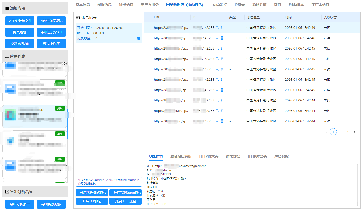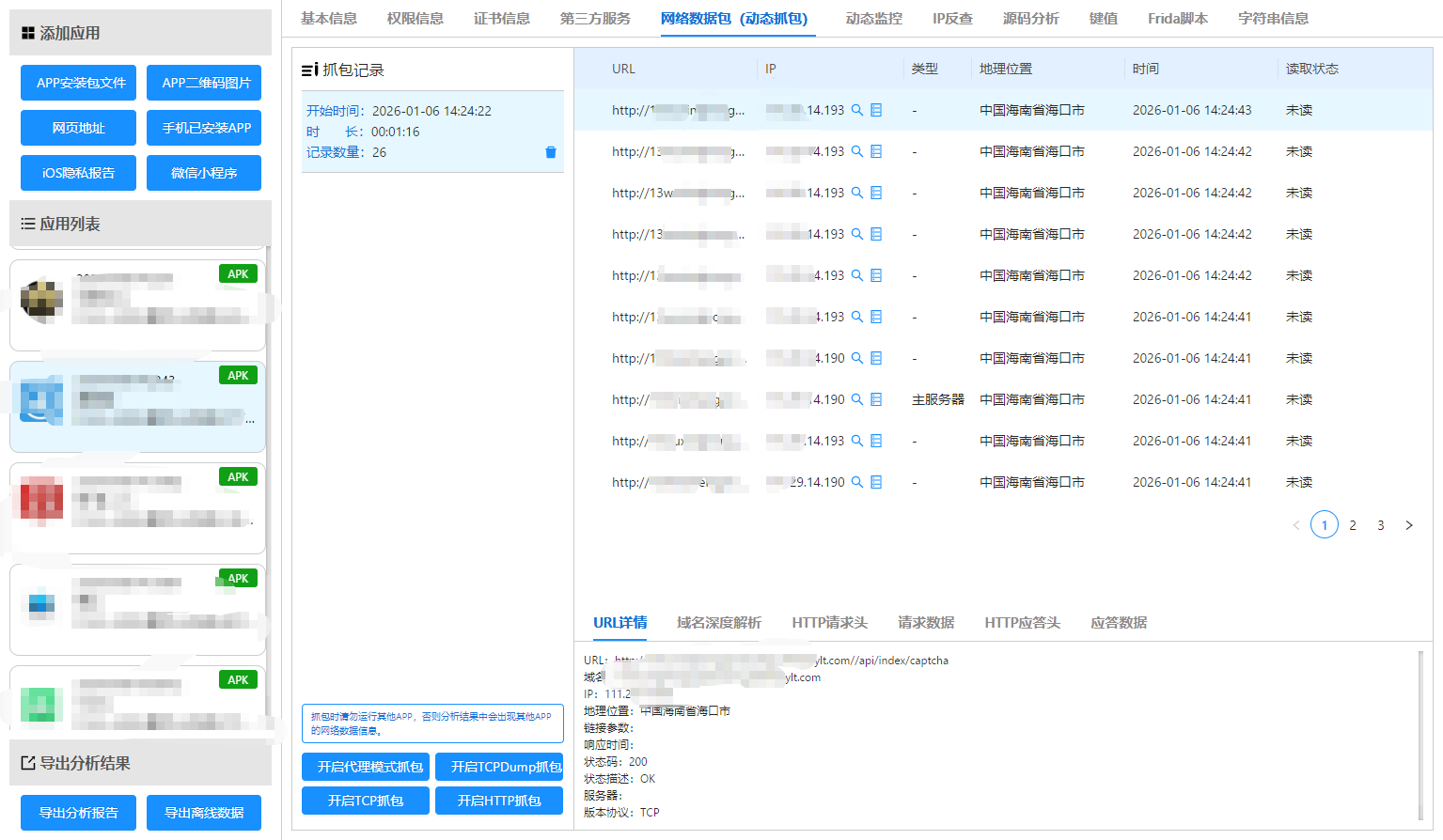 溯源引流渠道:以涉诈 APP 下载链接、咨询网站为起点,反向排查传播链条,使用LX-A206APP检测分析系统抓包到APP的IP地址,再通过技术手段锁定境内推广团队的社交账号、短视频账号,固定其发布广告、诱导用户的操作记录,确认团队成员真实身份与活动轨迹;