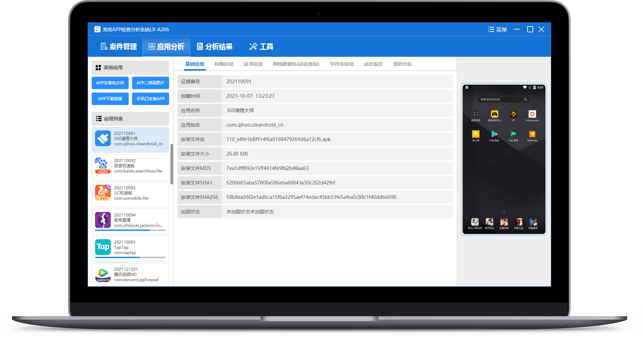 LX-A206 APP检测分析系统是一款针对APP应用进行深度检测分析的综合取证分析系统。系统支持批量对多个APP进行自动化分析取证,一键导出分析报告,提升取证效率。可分析APP的基本信息、权限信息、证书信息等静态结果,也可分析APP的网络数据信息,并自动进行溯源分析,解析IP地址,分析域名信息,精准获取涉案信息,为办案人员提供数据线索。